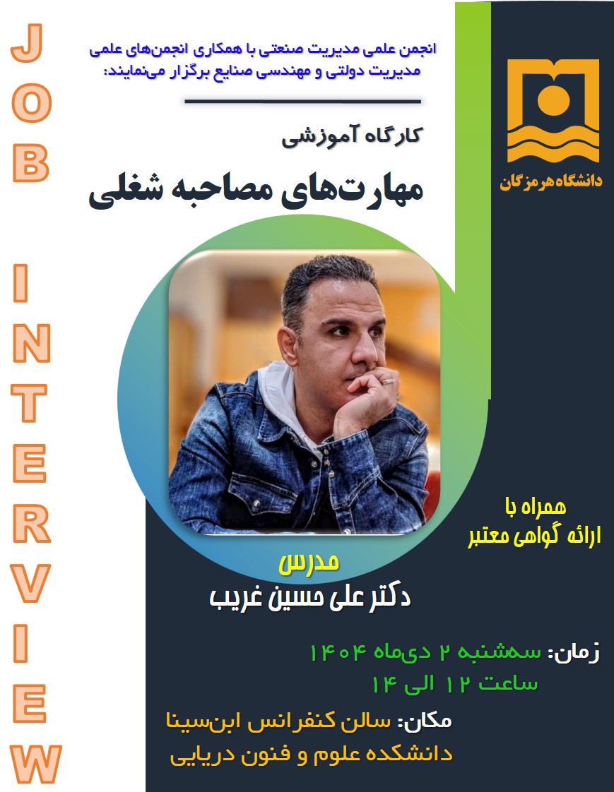 کارگاه آموزشی «مهارت‌های مصاحبه شغلی و رزومه‌نویسی» با تدریس جناب آقای دکتر غریب، سه‌شنبه ۲ دی‌ماه از ساعت ۱۲ تا ۱۴ در سالن کنفرانس ابن‌سینا- دانشکده علوم و فنون دریایی برگزار می‌شود. در این کارگاه، مهارت‌های کلیدی مصاحبه شغلی و اصول رزومه‌نویسی حرفه‌ای آموزش داده خواهد شد.