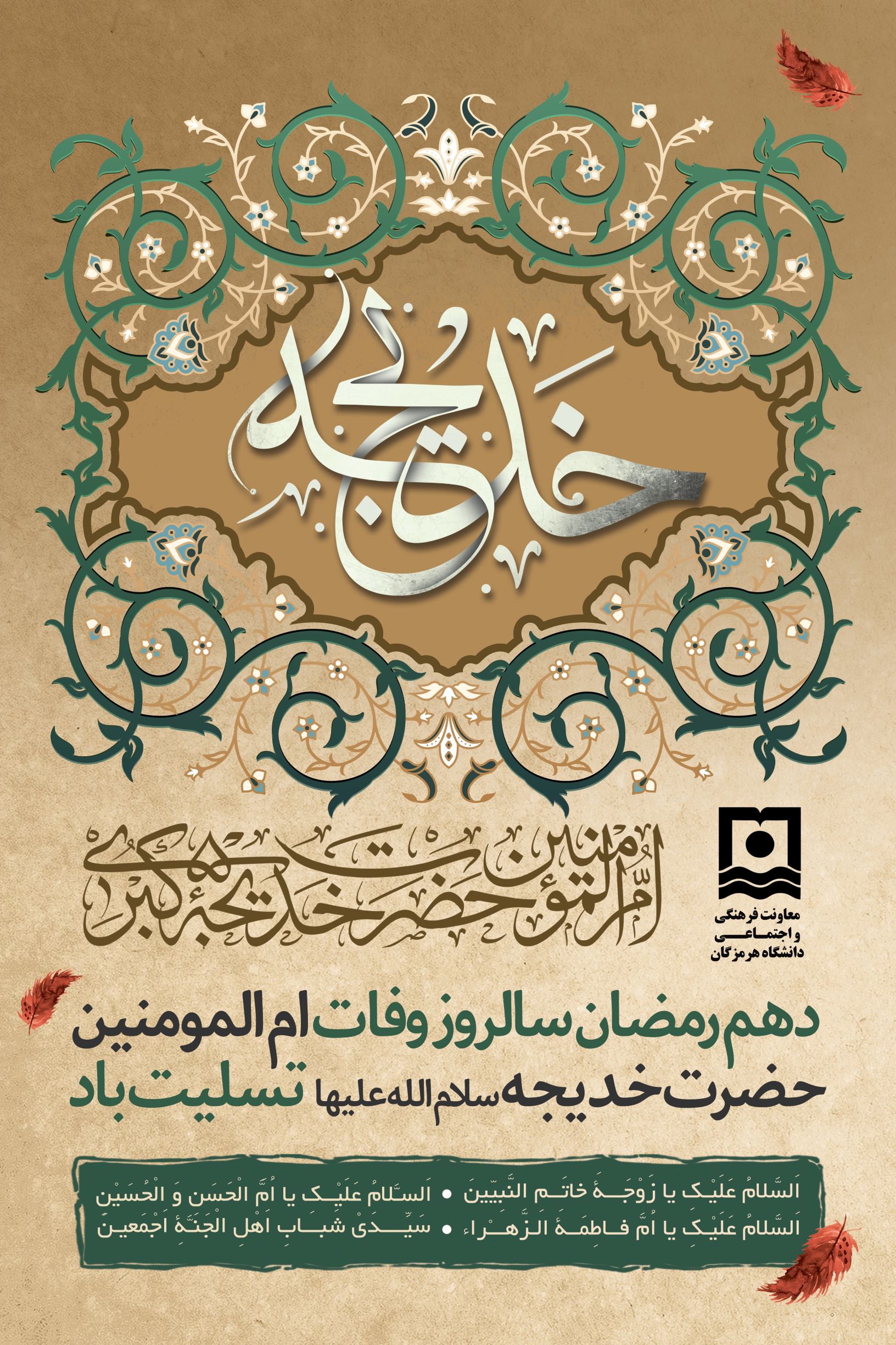 دهم ماه مبارک رمضان، سالروز وفات حضرت خدیجه کبری (س)، نخستین بانوی ایمان‌آورنده به رسالت پیامبر اسلام (ص) و یار وفادار ایشان است. آن بانوی بزرگ با ایثار و حمایت‌های مادی و معنوی خود، نقشی ماندگار در تثبیت اسلام ایفا کرد. سالروز وفات آن بانوی بزرگ را تسلیت عرض می‌نماییم.